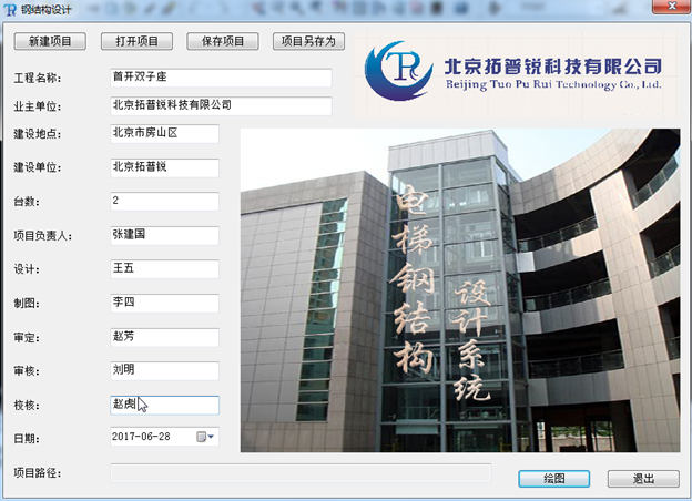 3. 項目數據錄入,在上圖中,可以輸入工程名稱、業主單位、建設地點、建設單位、臺數、項目負責人、設計、制圖、審核等項目信息,項目信息可以保存,以便重復使用,項目信息也可以對接ERP數據,便于企業管理。