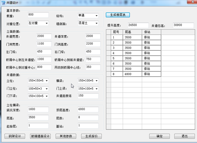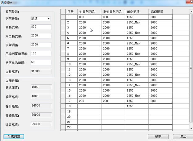 5. 鋼架設計參數的選擇,如鋼架起始位置、首檔支架、第二檔支架、支架間距、吊鉤到屋面頂部距離、樓層裝飾面厚等參數,同時計算出立柱高度、底坑深度、頂層高度、提升高度、井道總高、建筑高度等值,并生成鋼架數據表,如下圖: