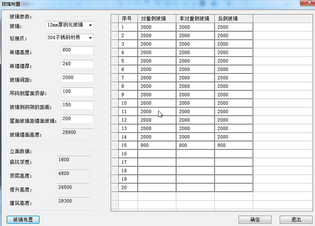 6. 玻璃墻面參數設計,在這里可以完成玻璃材質型號、駁接爪材質標準、磚墻高度、磚墻厚度、玻璃間距、吊鉤到屋面頂部、玻璃到鋼架的距離、屋面玻璃距墻面玻璃等值的選擇輸入,同時完成玻璃墻面高度、底坑深度、頂層高度、提升高度、建筑高度的計算,生產玻璃布置數據表,如下圖: