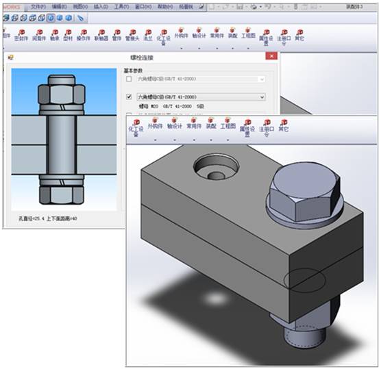 9、自動(dòng)匹配和裝配螺栓、螺母、墊圈、彈簧墊圈模型,如在繪制螺栓連接時(shí),軟件會(huì)同時(shí)提供螺栓、螺母、墊圈的選擇,之后會(huì)自動(dòng)將這些標(biāo)件插入并裝配在正確的位置,如下圖: