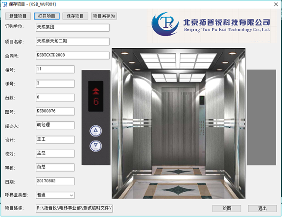 3. 項目數據錄入,在上圖中,可以輸入訂購單位、項目名稱、合同號、樓號、梯號、臺數、圖號、經辦人、設計、校對、審核、控制方式等項目信息,項目信息可以保存,以便重復使用,項目信息也可以對接ERP數據,便于企業管理。