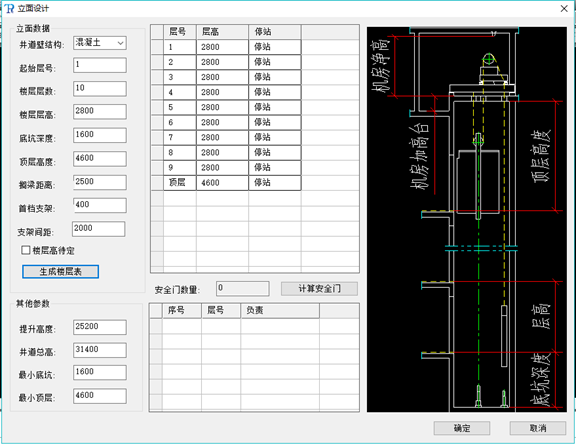 8. 在海立閣電梯生成土建圖的過程中,是需要生成立面圖紙的,在軟件界面中點擊立面設計,系統會彈出里面數據輸入對話框,在這里可以輸入井道壁的結構、起始層號、樓層層數、底坑深度、頂層高度等所需要的參數,這些參數可以根據廠家的不同需要進行更改,不需要生產里面詳圖的廠家,可以根據需要生產簡圖。