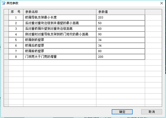 9.其它參數輸入界面,為了安全設計生產,不同的廠家在設計電梯時,都有很多最小值設置、關鍵參數尺寸設置等,在其它參數界面中即可完成這些參數的設定,設定后系統會自動提取并計算,用來比對相關參數的輸入合理性,不同廠家參數不同,如下圖。