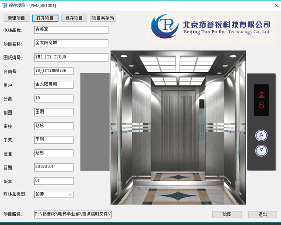 3. 項(xiàng)目數(shù)據(jù)錄入,在上圖中,可以輸入電梯品牌、項(xiàng)目名稱、圖號、合同號、用戶、臺數(shù)、制圖、審核、工藝、批準(zhǔn)、日期、版本、控制方式等項(xiàng)目信息,項(xiàng)目信息可以保存,以便重復(fù)使用,項(xiàng)目信息也可以對接ERP數(shù)據(jù),便于企業(yè)管理。