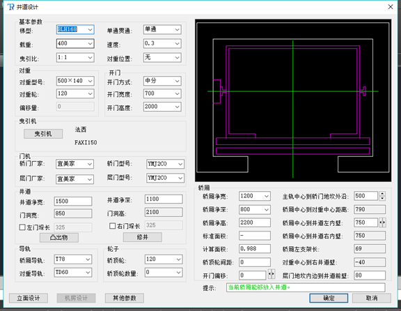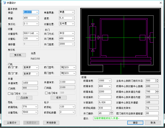 5. 點(diǎn)擊中間的示意圖可以彈出基本參數(shù)輸入界面(如下圖),如梯形數(shù)據(jù)選擇、對重參數(shù)設(shè)置、曳引機(jī)廠家選擇、門機(jī)廠家型號選擇、井道尺寸突出物及修井選擇、導(dǎo)軌型號選擇、輪子型號及數(shù)量輸入、轎廂等數(shù)據(jù)的輸入。
