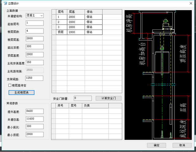 6. 在宜美家電梯生成土建圖的過程中,是需要生成立面圖紙的,在軟件界面中點(diǎn)擊立面設(shè)計(jì),系統(tǒng)會彈出里面數(shù)據(jù)輸入對話框,在這里可以輸入井道壁的結(jié)構(gòu)、起始層號、樓層層數(shù)、底坑深度、頂層高度等所需要的參數(shù),這些參數(shù)可以根據(jù)廠家的不同需要進(jìn)行更改,不需要生產(chǎn)里面詳圖的廠家,可以根據(jù)需要生產(chǎn)簡圖。