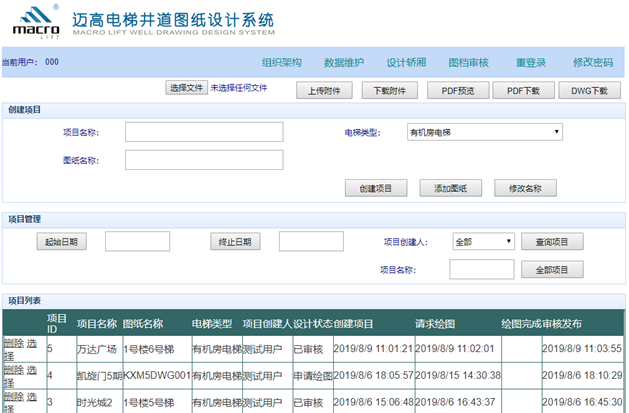 2. 網頁版電梯井道圖設計系統采用權限登錄方式,權限分為管理員登錄、用戶登錄兩種。管理員權限主要用來維護系統數據、分配系統用戶人員權限。用戶登錄后,可以使用系統提供的各項功能,如圖紙數據上傳、文檔下載、文檔審批等。管理員登錄后界面如下圖: