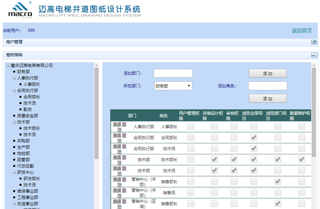 4. 組織架構:組織架構是企業人事管理結構,只有系統管理員權限才可修改,完成人員的添加、刪除、修改;完成人員權限的設定,人員權限包括設計權限、審核權限、瀏覽權限等,如下圖: