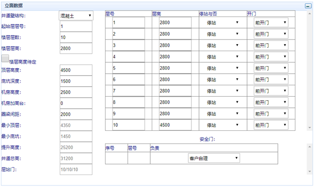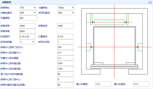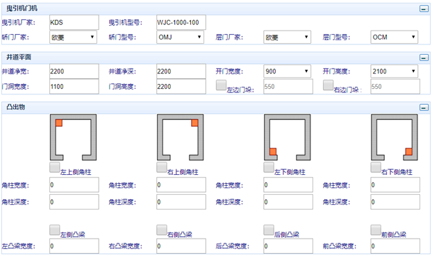 6. 設計轎廂:設計轎廂頁面,主要是用來輸入或選擇廠家電梯數據的,內容包括項目名稱、產品型號、圖號等項目數據;電梯類型、梯型、單通貫通、速度、對重、開門方式等基本參數;曳引機廠家、轎門廠家等數據;井道寬、井道深、門洞等數據;轎廂導軌、對重導軌、轎廂凈高、轎廂凈寬等轎廂數據;小機房、大機房、無機房、控制柜等數據;立面數據包括井道壁、樓層數、層高、底坑深度、最小底坑、層站門、井道總高等數據,如下圖: