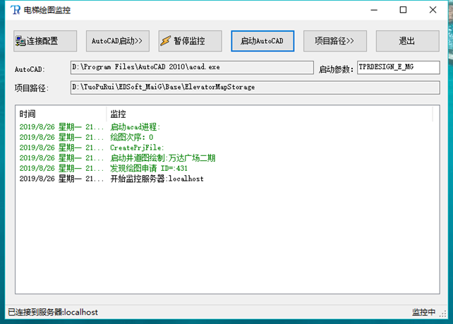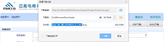 7、繪圖:轎廂數據選擇輸入完成之后,點擊頁面上面的繪圖按鈕,數據會自動上傳到服務器,服務器自動繪圖監控程序會啟動服務器上已經安裝好的AUTOCAD軟件,并在AUTOCAD中自動繪制與數據相匹配的圖紙,繪制好的圖紙會生產下載鏈接,點擊頁面下載即可,整個過程只需要幾分鐘即可完成。點擊繪圖按鈕如下圖: